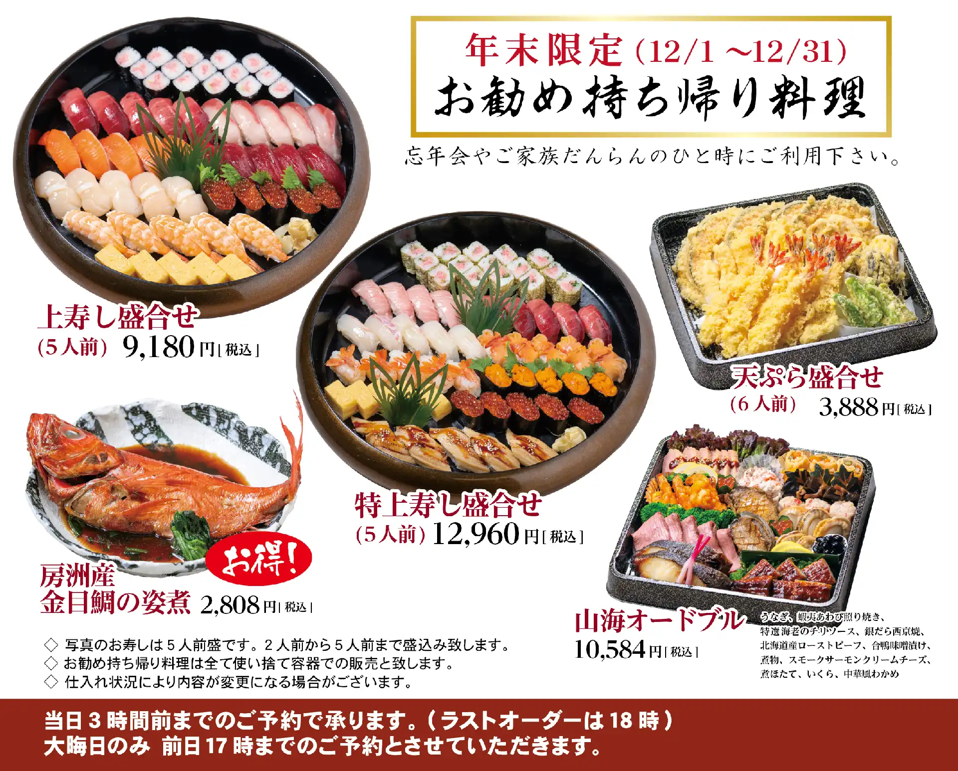 上寿し盛合せ(5人前) 〈わさび有り〉 | ×9,180 円 | 0 円 |
